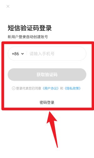 1、打开应用后默认展示为短信验证码登录界面,用户可输入手机号并获取验证码完成快速注册登录操作。