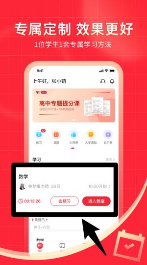 2、首页提供个性化课程安排,学生可根据课表提醒点击去预习或进入教室参与对应学科的在线学习。