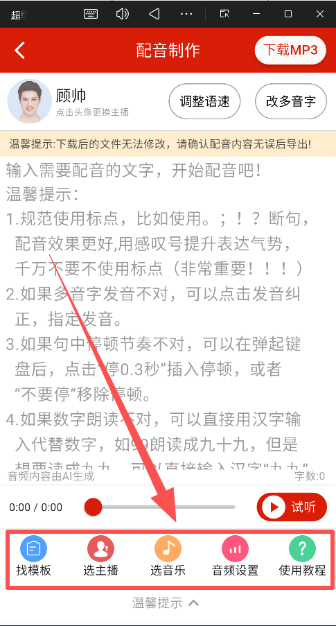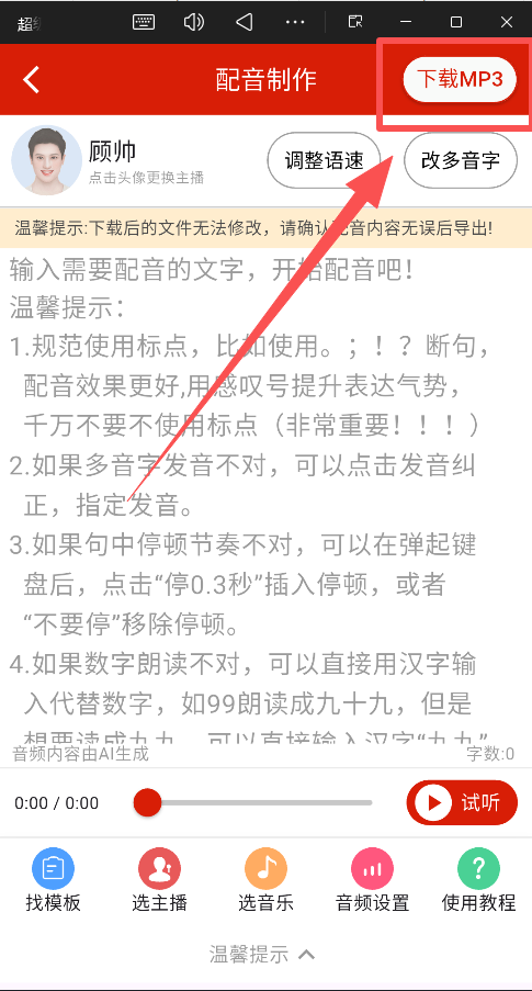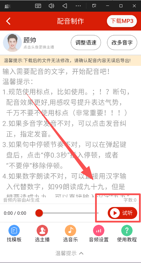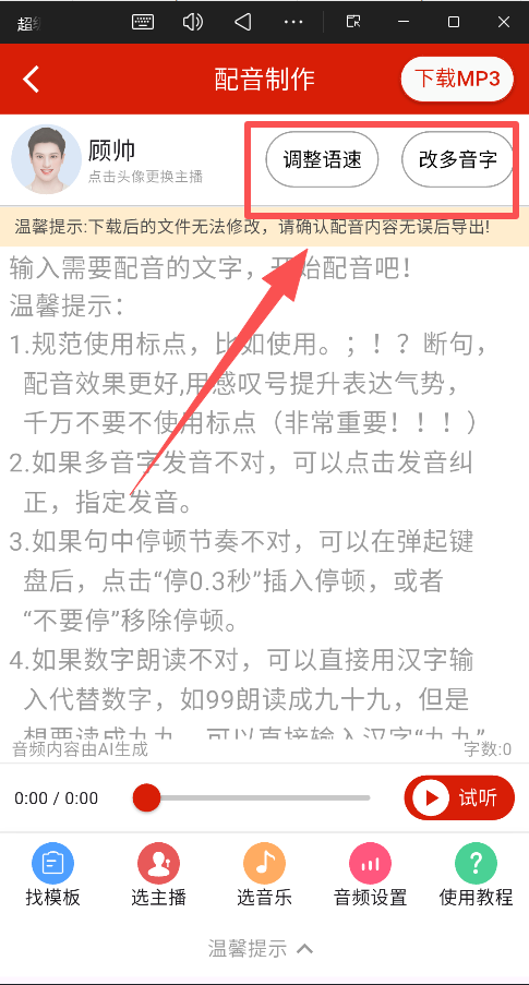 4、试听与调整:生成后仔细试听,利用工具对多音字、停顿等进行微调。