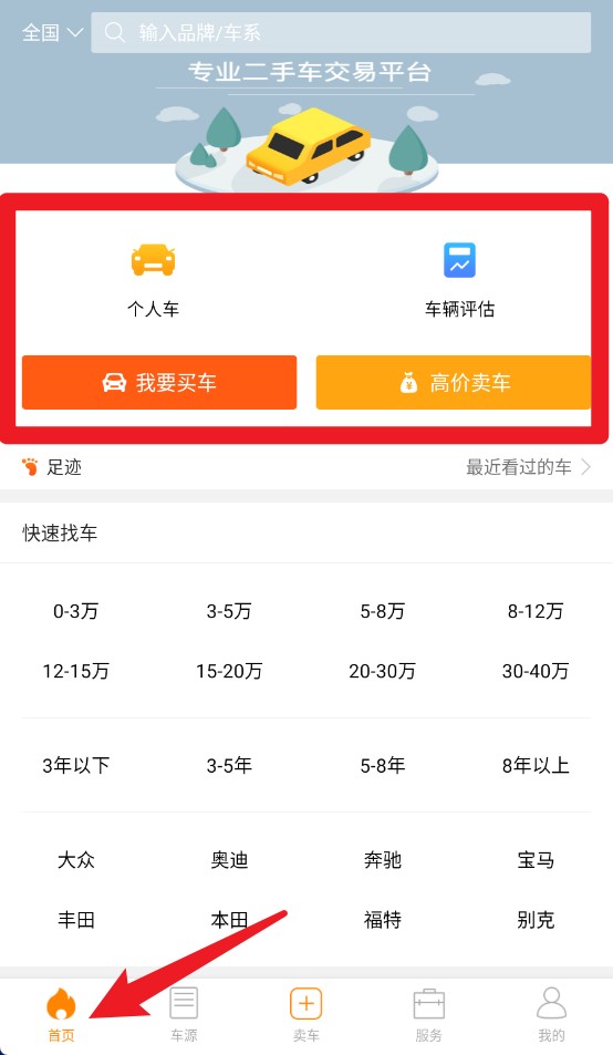 1、在首页功能区可选择个人车或估价功能,并快速点击我要买车或高价卖车进行操作。