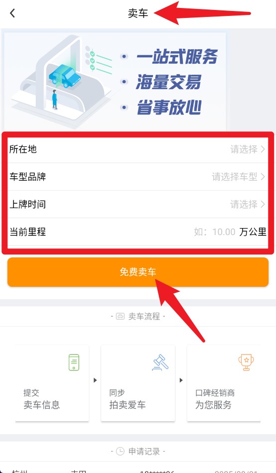 3、在卖车页面填写所在地、品牌、上牌时间及里程后,即可一键提交免费卖车申请。