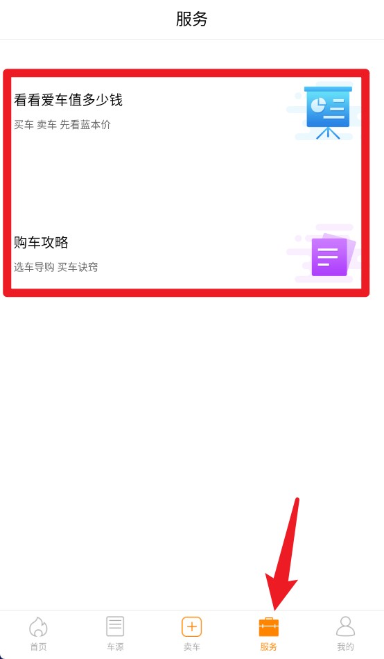 4、服务页面提供爱车估值及购车攻略,方便用户卖车前先估价、买车时有策略。