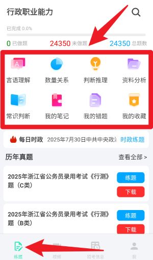 2、在练题模块中,用户可根据题型进行分类选择练习,包含言语理解、数量关系、判断推理等多个专项。