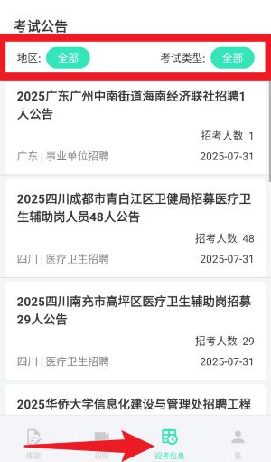 4、进入招考信息板块,可根据地区与考试类型筛选查看最新公务员与事业单位招聘公告。
