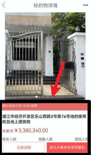 3、进入房产拍品详情页可查看地块位置、当前出价和拍卖时间,同时可设置提醒并提交竞拍预缴款。