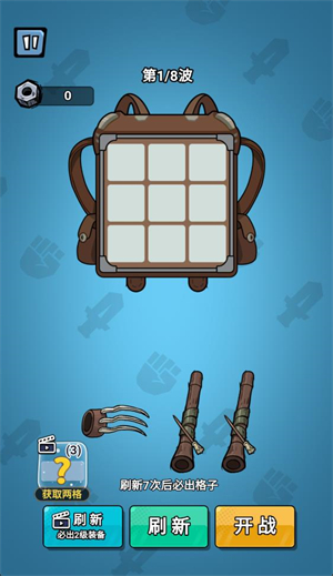 2.进入关卡后玩家需要将初始武器放入背包里的格子,相同的武器可以合并来提升等级,点击刷新可以获得新的武器。
