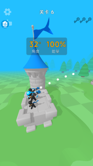 2、在关卡中,玩家需要点击屏幕滑动来控制弓箭射击的角度力度,射杀全部敌人过关。