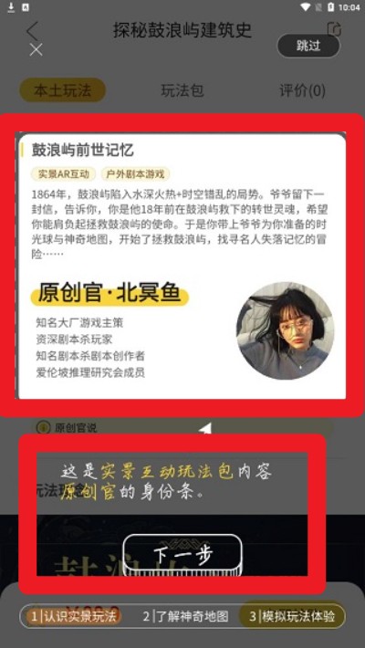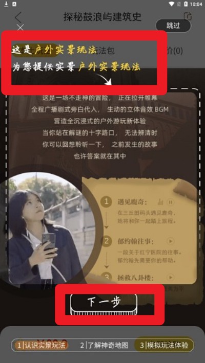 4. 屏幕将说明当前是户外实景互动玩法,并详细介绍玩法方式及任务机制,再次点击下一步进入体验。