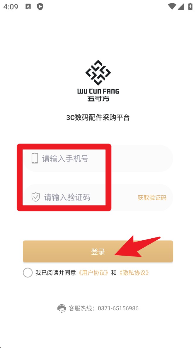 1. 打开App后,输入手机号与验证码,并勾选用户协议后点击下方登录按钮进入系统。