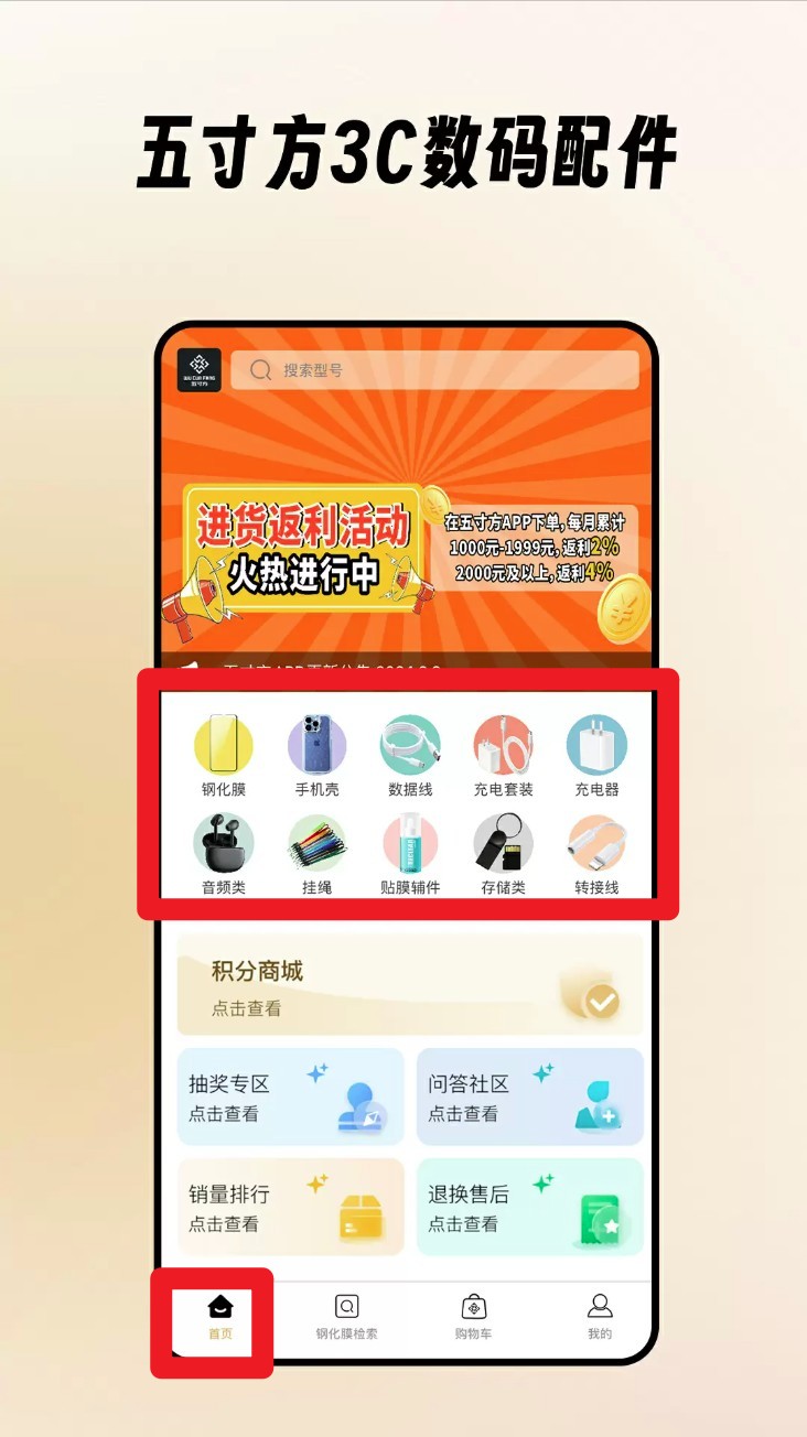 2. 登录后默认进入首页,可在上方看到热门活动,下方分类包括钢化膜、手机壳、充电器等商品。