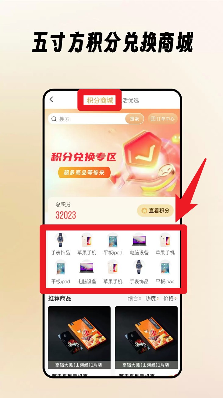 3. 切换至积分商城,可查看当前可用积分并兑换如手机、平板等丰富实物奖品。