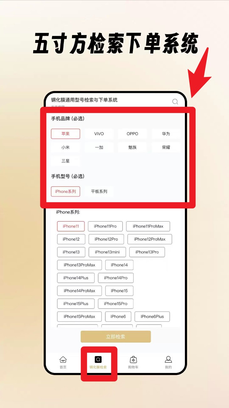 4. 点击底部钢化膜检索图标,选择品牌与手机型号后,点击立即检索即可查看相关型号信息。