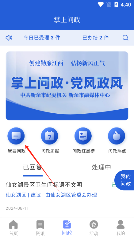 5、找到 “问政” 板块并点击进入,在此可提交提问、投诉等诉求,反馈相关问题。