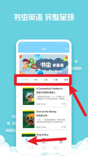 1、用户可以根据自己的英语水平在首页选择入门级到四级的分级阅读内容,便于循序渐进进行英语学习。