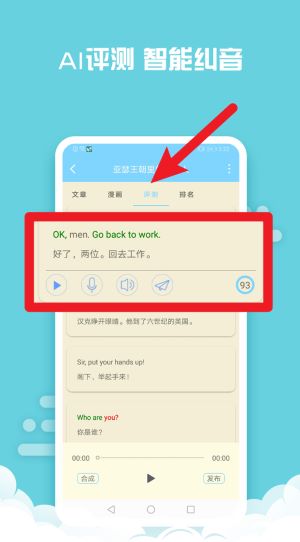 4、AI语音评测功能支持用户跟读训练,并智能评分纠音,帮助纠正发音提升口语水平。