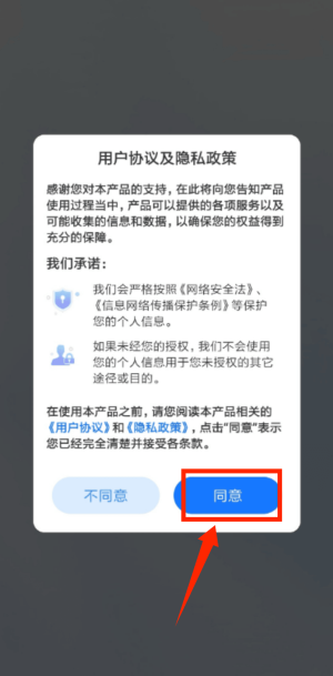 1、打开软件后,在弹出的用户协议及隐私政策窗口点击 “同意”,进入应用主界面。