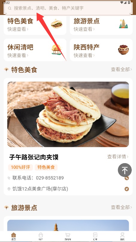 3、进入首页后通过搜索功能栏输入景点、清吧、美食等关键词查找目标商家信息。