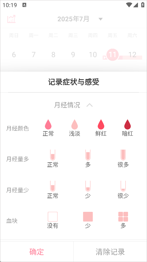 3、进入记录页面后,根据自身实际的月经症状情况,勾选或填写对应内容;