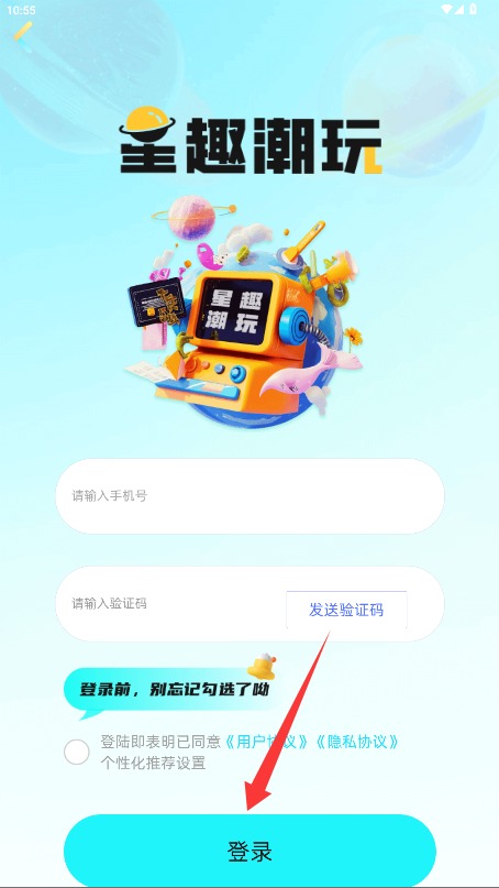 3、在登录界面输入手机号和验证码,勾选同意协议条款后点击登录按钮进入系统。