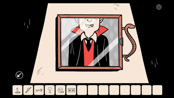 现在可以打开最后一扇柜门了,从里面得到一只螺丝刀,还有一瓶红酒。如今有了螺丝刀,便可以拆除吸血鬼画像画框上的螺丝钉了。就在两颗螺丝钉都掉落之后,突然你看到画中的事物变了,吸血鬼变成了那个留着长发的女孩,她的一只胳膊从画中伸出,想要抓住你。你下意识的用手挡住脸,但没有感觉到什么。你再次看向那幅画,并没有什么长发女孩,仍旧是那个吸血鬼。打开画,那后面是个图案迷题。你想到了告示板后面的大蒜十字架什么的,那些不就是和吸血鬼有关的东西吗?你按照顺序先拿出了大蒜,吸血鬼害怕地用披风挡住了脸,同时画上出现了右边三角是黑色的图案。下一个东西是杯子,空杯子对他没有效果,你把红酒倒了进去,再拿给吸血鬼,这时他的嘴角出现一抹红色,然后伸手在玻璃上画了个红红的X,这应该代表构成方块的四个三角都应该是白色的。下一个是十字架,画上出现了左右三角是黑色的图案。最后是镜子,它映不出吸血鬼的身影,于是画上只出现左边和下方三角是黑色的图案。把四个图案输入画后的迷题中,听见了正确的响声,拉动把手,露出了后面的开关。