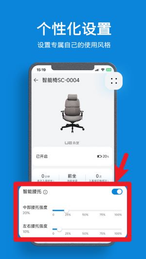3、进入设备详情页后,可以根据个人需求调节智能椅的腰托强度,实现中部和左右腰部支撑力度的个性化设置。