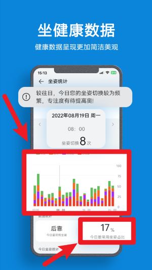 4、通过坐姿健康统计页面可查看每日坐姿切换次数及习惯坐姿占比,有助于改善长期不良坐姿带来的健康隐患。