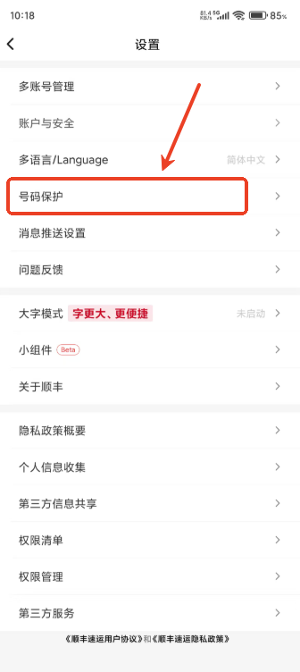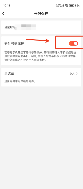 4.点击开启即可保护好自己的号码需要验证才可以被他人使用寄件。