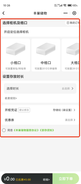 3.自由根据你的包裹大小选择柜机,格口,存储时长以及凭证等。