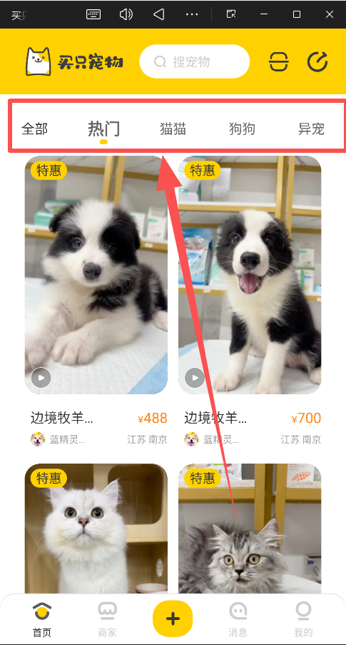 3、热门分类:猫猫、狗狗、异宠;按品种、血统、级别筛选