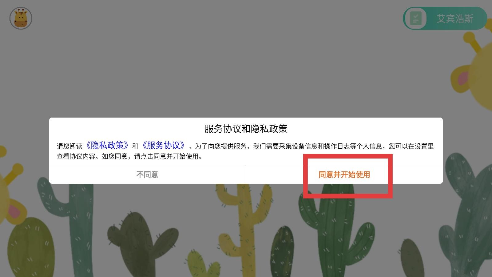 1、进入四五认字软件后,会弹出服务协议,认真阅读软件给出的建议,点击同意即可继续下一步操作。