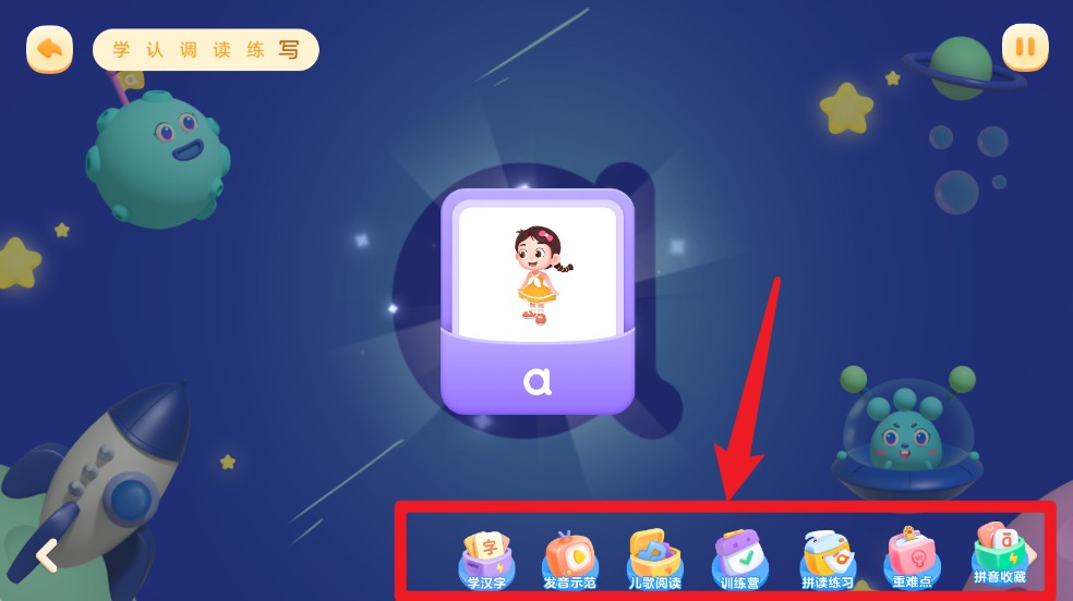 1、在首页功能区可看到学、认、调、读、练、写六大模块,覆盖拼音学习全过程。