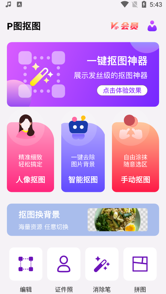 1、打开 P 图抠图官方版软件,进入主界面后,根据需求点击对应功能模式(如抠图、修图、美颜等)。
