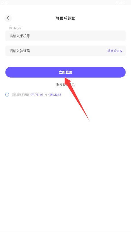 2、在登录页面输入手机号和验证码,勾选同意平台相关协议后点击立即登录进入应用。