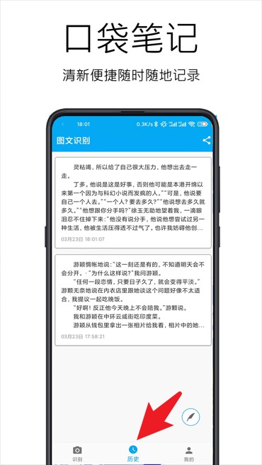 3、 文字保存:每次识别结果可存储至设备本地,自动生成识别历史记录。