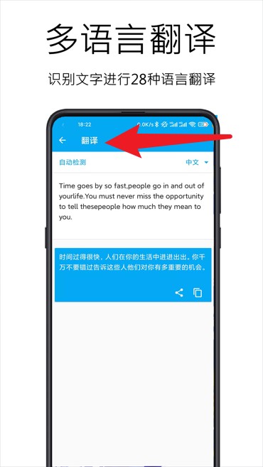 5、内建翻译功能支持28种语言,快速将识别文字进行跨语言翻译处理。