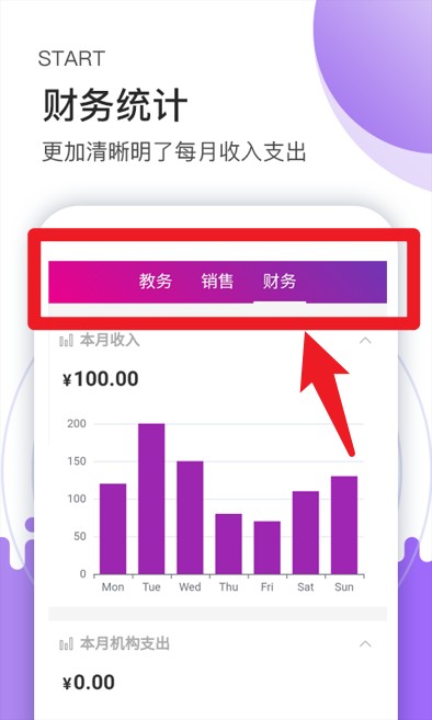 2、财务统计模块可按教务、销售、财务分类切换,帮助管理者精准掌握每月收支。