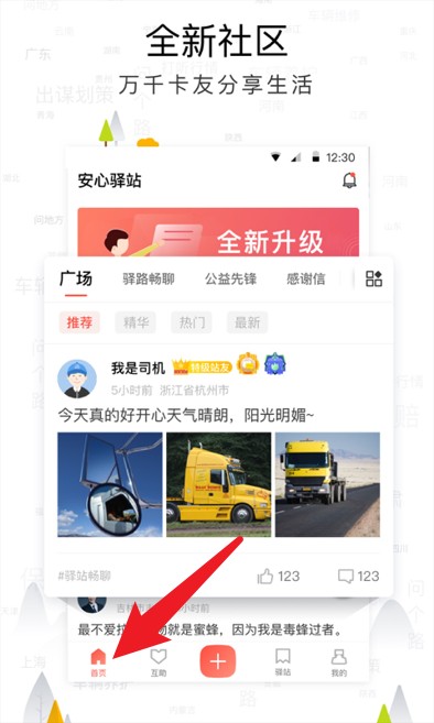 1、在全新社区广场中,卡友可以发布图文动态,分享运输途中见闻与心情,获得点赞与评论互动。