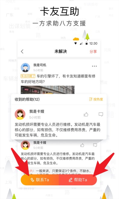 2、卡友互助功能支持紧急求助,其他卡友看到后可选择联系Ta或帮助Ta提供支援与建议。