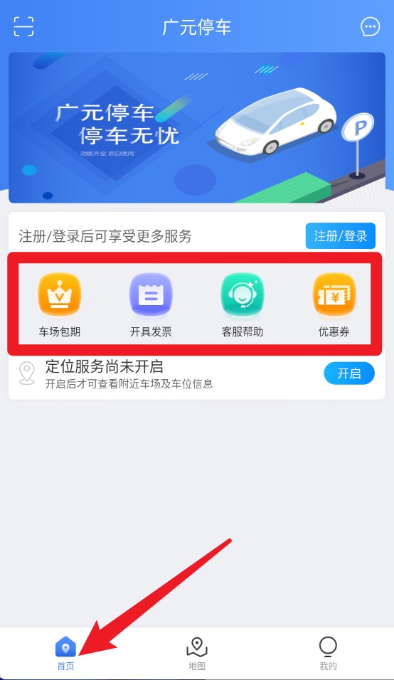 1、首页页面整合车场包期、发票开具、客服帮助等快捷功能,方便用户快速处理停车相关事务。