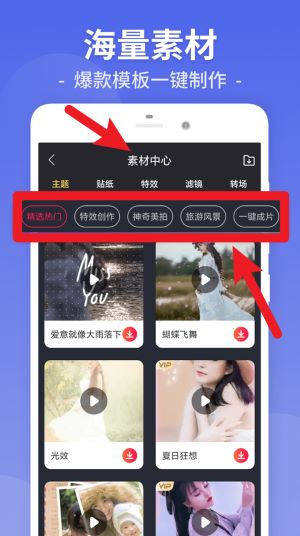 2、在素材中心中挑选热门模板,涵盖神奇美拍、特效创作等多样风格,支持一键成片功能。