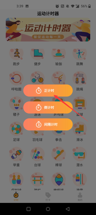 2、选择对应运动类型(如跑步),页面将呈现正计时、倒计时、间隔计时选项。
