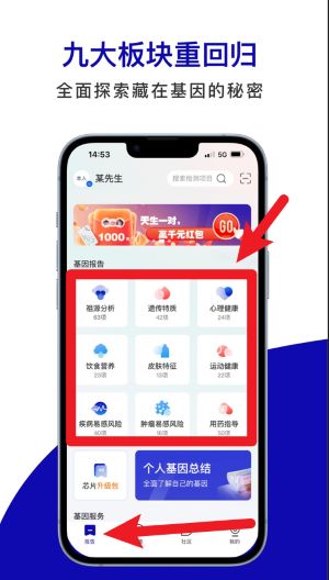1、点击首页底部报告按钮,即可进入九大基因分析模块页面,全面了解祖源分析、遗传特质等各项基因信息。