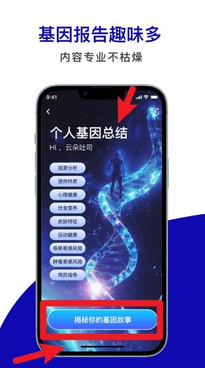 3、在个人基因总结页面中,点击揭秘你的基因故事开始查看完整的基因报告内容,图文并茂且内容专业不枯燥。