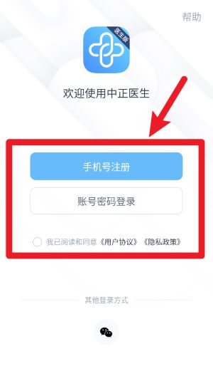 1、首次打开中正医生APP时,点击手机号注册按钮进行账号注册并登录系统使用。