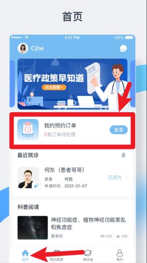2、在首页中点击我的预约订单可快速查看当前待处理的预约信息并进行相关处理。