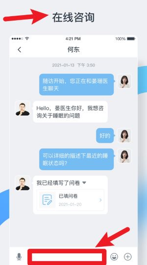 3、在在线咨询界面可实时与患者进行一对一沟通,并通过底部输入框发送文字或语音信息。
