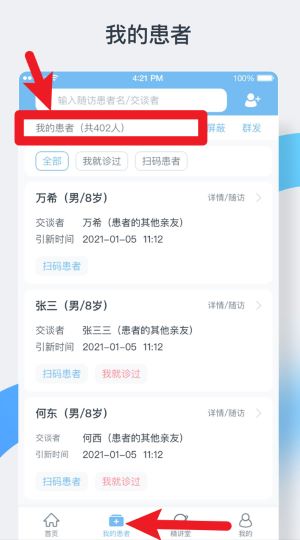 4、在我的患者页面可以查看所有已就诊患者资料,并通过筛选功能快速定位目标患者。