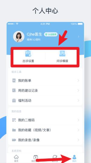 5、点击我的进入个人中心,在此可设置出诊时间、创建问诊模板,方便后续高效接诊。