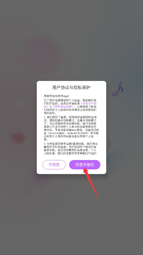 1、初次使用需阅读平台服务条款与隐私政策,确认后点击同意并继续按钮进入应用。