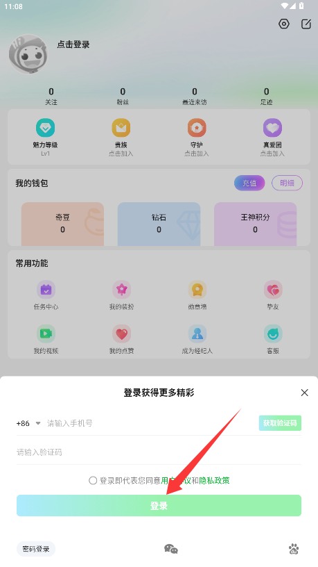 3、输入注册手机号并填写收到的验证码,勾选服务协议后点击登录按钮进入使用。